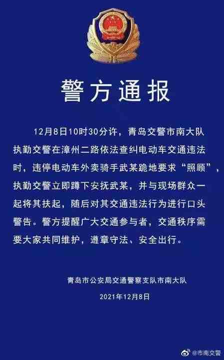 8日晚间,青岛交警市南大队官方微博@市南交警 发布通报:12月8日10时30分许,青岛交警市南大队执勤交警在漳州二路依法查纠电动车交通违法时,违停电动车外卖骑手武某跪地要求“照顾”,执勤交警立即蹲下安抚武某,并与现场群众一起将其扶起,随后对其交通违法行为进行口头警告。