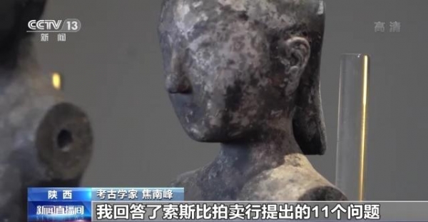 考古学家 焦南峰:在拍卖之前,把这6件陶俑,从拍卖的名单里拿出来了。我受国家文物局委托,我回答了索斯比拍卖行提出的11个问题,为什么说是中国的?为什么说是陕西的?为什么说是西汉的?等等类似问题。