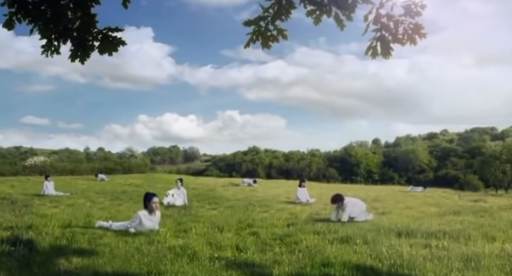 镜头还拍摄她们在田野上伸展着自己的身体的画面。