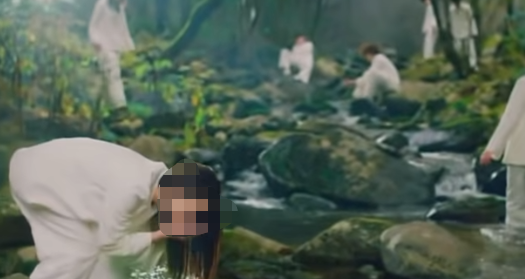 该广告视频显示,一名男子背着巨大的摄像机,徒步穿过树林。忽然,画面里出现了一群穿着白色服装,饮用山泉水的年轻女性。