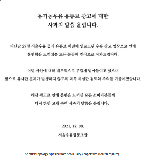 声明中,首尔牛奶表示:“我们真诚地向所有因YouTube广告而感到不安的人道歉。我们怀着沉重的心情接受这件事,并将对内部进行审查,特别注意防止今后发生类似事件。”
