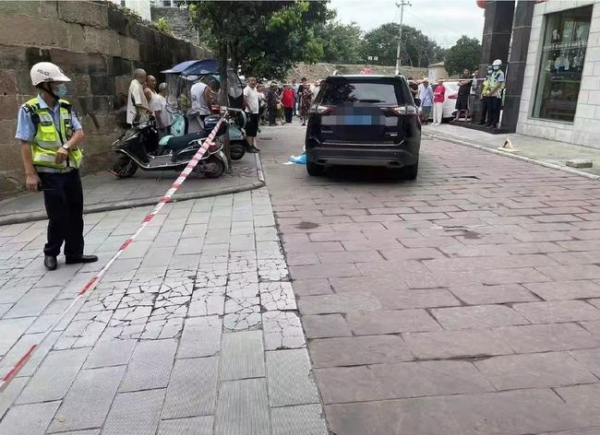 记者从当时事发现场的监控视频中看到,小昊跑着穿过马路,一辆黑色SUV从城墙外的入口开进来左转弯。车子的左前方撞上小昊,随后停了下来。画面中,小昊和车辆几乎同时出现。事发当时的照片显示,驾驶员穿着一双高跟鞋。