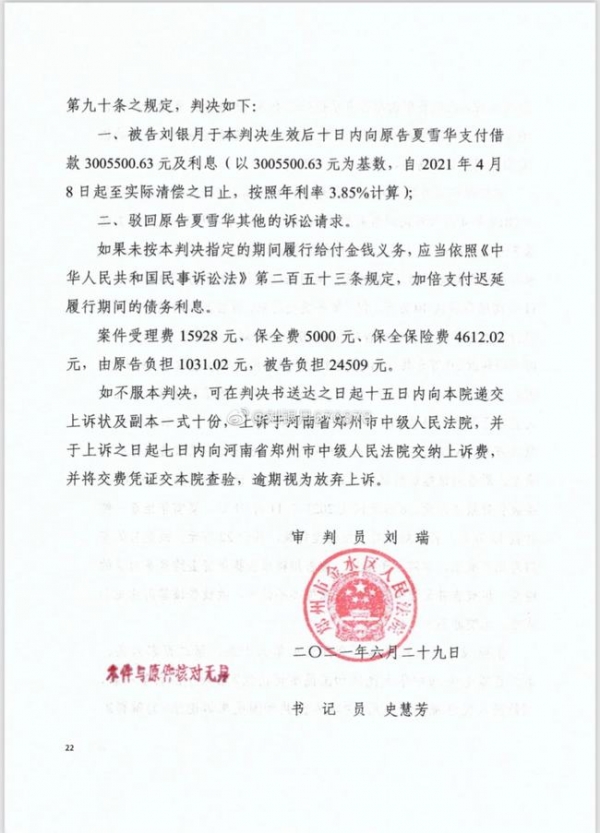 结合刘银月在微博发布的一份判决书还可知,案件经过二审,今年11月,法院判决刘银月支付夏雪华借款300余万元及利息。