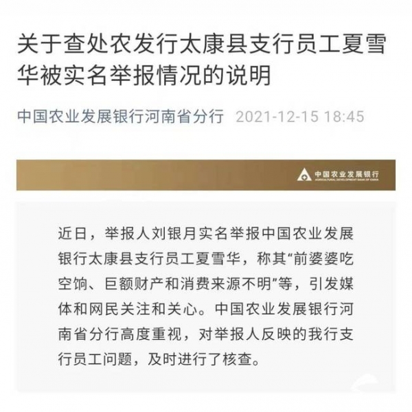 同时,对于刘银月举报夏某华其家庭有“巨额财产来源不明”问题,河南省分行及周口市分行纪委经核查,目前没有发现夏某华本人收受客户礼品、礼金及涉嫌职务违法犯罪等问题。