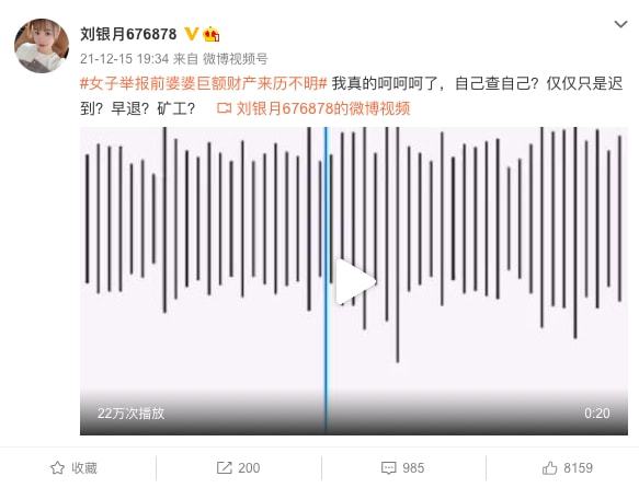 刘银月在视频中说:“我实名举报前婆婆中国农业发展银行太康支行员工夏某某,常年不上班,月月领工资吃空饷占取国家财产,他们家在多地有8套房产,9间商铺,四辆汽车,吃穿用度等全部都是名牌,巨额财产和消费来源不明。”