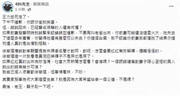 而台湾知名网红也炮轰徐若瑄。认为徐若瑄应该提告李靓蕾捍卫名誉才是,在网上喊话王力宏来帮忙解释的做法太蠢。即使王力宏真的出来解释,以他现有的名誉,大众会相信吗?