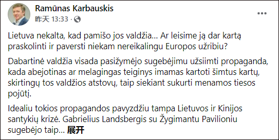 同日,立陶宛“影子”总理、最大反对党“立陶宛农民和绿党联盟”主席卡尔鲍斯基斯在脸书上发文,怒斥“现政府疯了”,其对华政策将成为阻碍立陶宛经济发展的障碍。