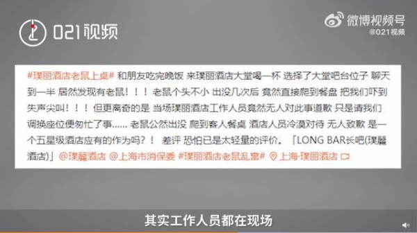 “食品安全”是很多人都关注的问题,谁能想到上海一五星级酒店里会出现老鼠爬上餐盘的情况!1月4日晚,网友@Smile_Chloe发微博称,当晚和朋友在上海静安区五星级酒店璞丽酒店吧台聊天时,发现一只个头不小的老鼠出没两三次,最后竟然直接爬上餐盘!食客吓得惊慌尖叫。