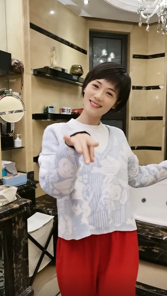董丽萍身后的豪宅内景也十分吸睛。她当天似乎是在家里的卫生间拍摄,整个房间都采取了大理石装修,洗漱台和墙面的柜子上摆满了各种护肤品化妆品,而且她家还有一个圆形大浴缸,正对着天花板的水晶吊灯,看着就价值不菲。