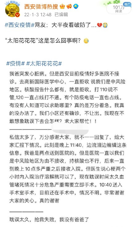1月5日,西安网友“太阳花花花00000”发文曝光了相似的经历,其父亲于1月2日中午突发心绞痛,直到晚上10点多才被医院接收进行手术,然而一切都晚了,父亲于1月3日凌晨离世。