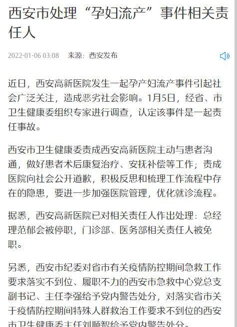 经过陕西省、西安市卫生健康委组织专家进行调查,认定该事件是一起责任事故。西安高新医院总经理范郁会被停职,门诊部、医务部相关责任人被免职,西安市急救中心和市卫生健康委的相关责任人也被处分。