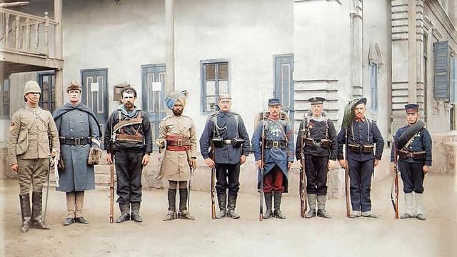 图1:1900年5月28日,八国联军以镇压中国义和团运动为借口,悍然发动了侵华战争,行瓜分和掠夺大清帝国之实。8月14日,北京城沦陷,其中有"万园之园"之称的圆明园,被英法联军劫掠,后又一把火烧光,终成废墟。9月7日,《辛丑条约》签订,中国自此彻底沦为半殖民地。左起:1英国、2美国、3澳大利亚(随英军作战)、4印度(随英军作战)、5德国、6法国、7奥匈帝国、8意大利、9日本。(八国联军还包括未在照片中的俄罗斯)