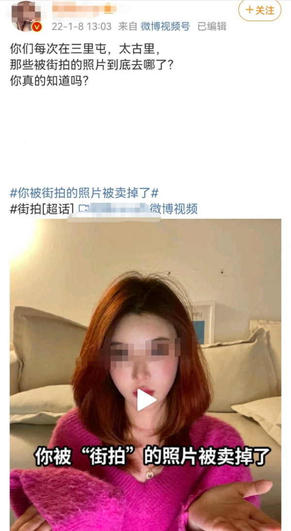 这位女博主称,自己每次路过北京三里屯,都会遇到街拍的人拿着长枪短炮在拍摄,虽然不喜欢但也没理会,直到收到了一条网友私信,说她被偷拍了,而且还有她的裙底照。