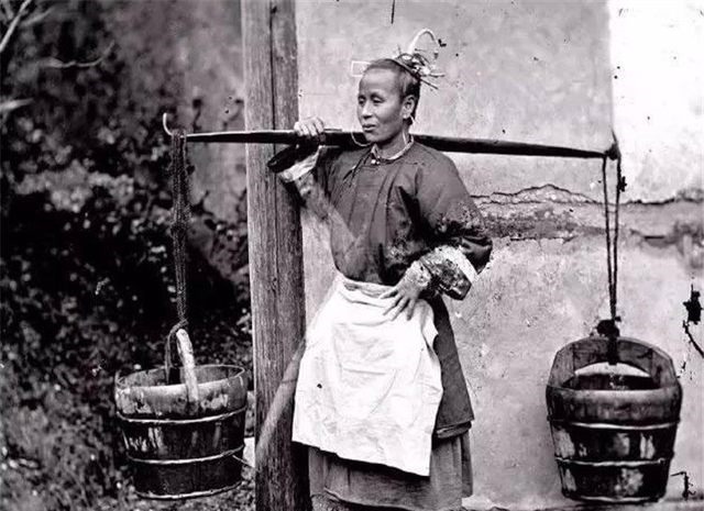 晚清时期一位挑着担子的老妇人,服饰很是普通,眉宇间可见其愁苦,可见生活极为的不易。
