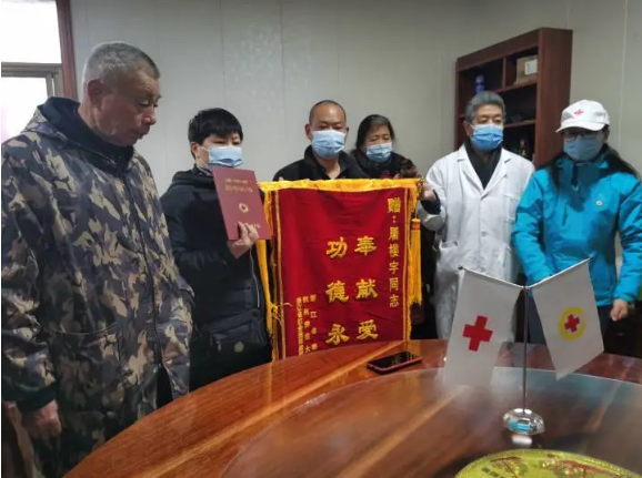 △1月11日上午,绍兴市红十字会给屠楼宇的家人颁发荣誉证书,杭州师范大学给他们送上锦旗。