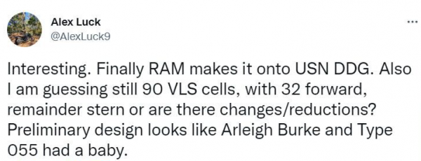 美国海军20年来没有新平台大规模入役,在解放军大量服役055型驱逐舰的今天,DDGX一经亮相,就引发了很多讨论。由于DDGX的未来版本采用了隐身设计和传统的飞剪艏,不少美国网民戏称,DDGX长得就想“阿利·伯克和055的私生子”。