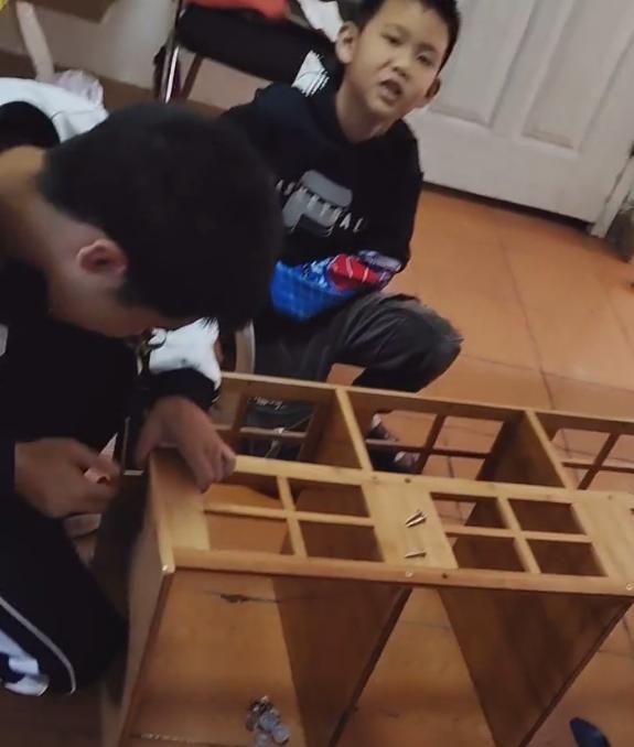 视频中可以看到,孙卓身上还穿着校服,显然刚刚从学校回到家,连衣服都没来得及换,就在为姐姐拼装书架,拼装得非常用心。