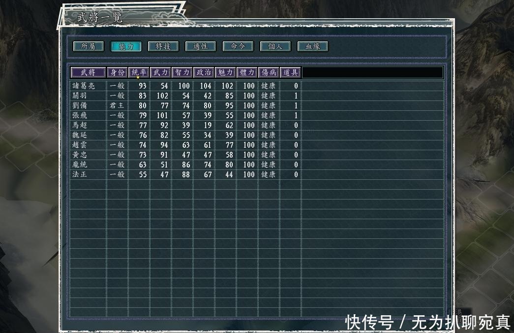 关羽张飞同样位于蜀汉势力里面,但在游戏里面他们已经被大幅度削弱,关羽统御83.武力102,技能是神将,道具同样是青龙偃月刀附带扫昂效果。张飞79的统御,101的武力,技能是恫吓,道具是蛇矛附带猛者效果。刘备80的统御力,95的魅力,遁走特技不变,自带的卢马附带强袭特技。而其余武将马超、赵云、魏延、黄忠等人的统御力都在74-80以内徘徊,属于三流武将行列。