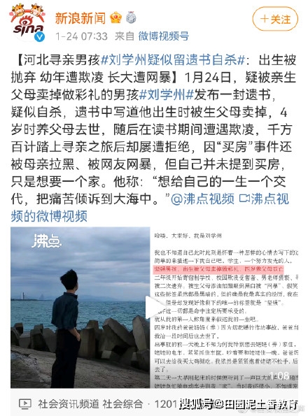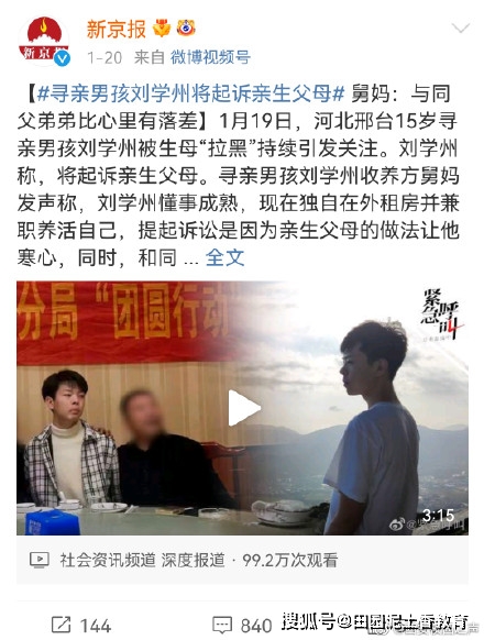 刘学州本是抱着期待寻找亲生父母,好不容易找到却被母亲拉黑,父亲说他卖惨成功,是网络乞丐,@新京报 更报道称刘学州让亲生父母给他买房,但这个说法被刘学州否认。报道一出,刘学州微博下满是骂声,15岁的他被扣上“心机”的帽子。1月24日刘学州去世,新京报删除报道关闭评论。