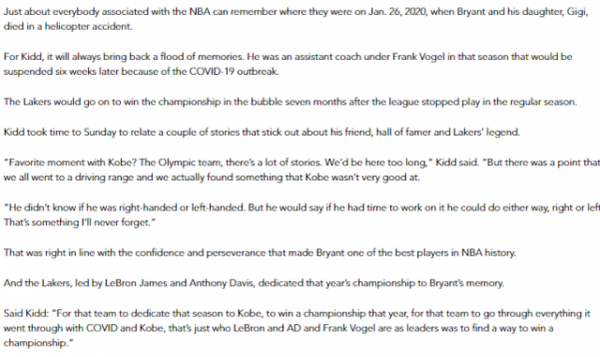 基德当时是湖人的助教,他说,“让那支球队把那个赛季,奉献给科比,在那一年赢得总冠军,让这支球队经历与疫情和科比去世的影响淬火重生,这就是詹姆斯、浓眉哥和沃格尔作为领导者,所要做的找到赢得总冠军的方法。”