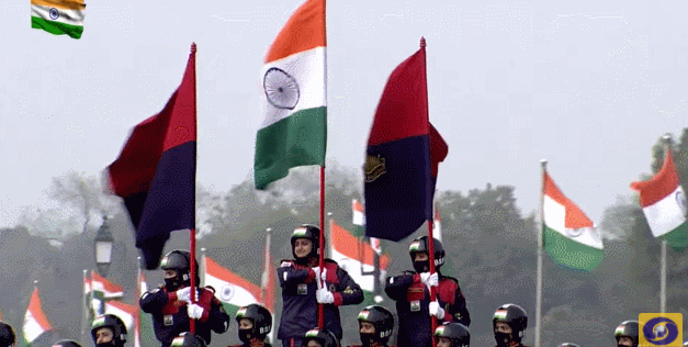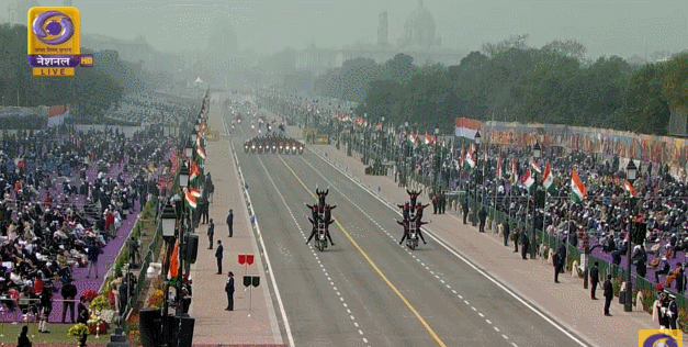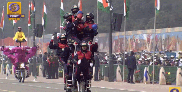 在女子特技小组表演完之后,印藏边境警察部队(ITBP)摩托车特技小组紧接着上场。报道称,他们展示了一个引人注目的15人团队莲花队形,赢得了很多赞誉。另外,“列队飞过”队形也让观众非常兴奋。此外,他们还表演了摩托车上的翻单杠和翻转,印媒称,“精彩的表演让所有的观众都为之着迷”。
