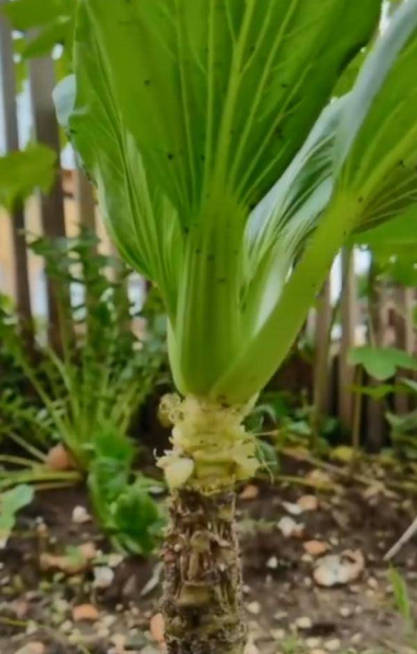 画面中,男子一片片掰着上海青的叶子,而底下的杆竟然长成了粗粗的“老桩”模样。