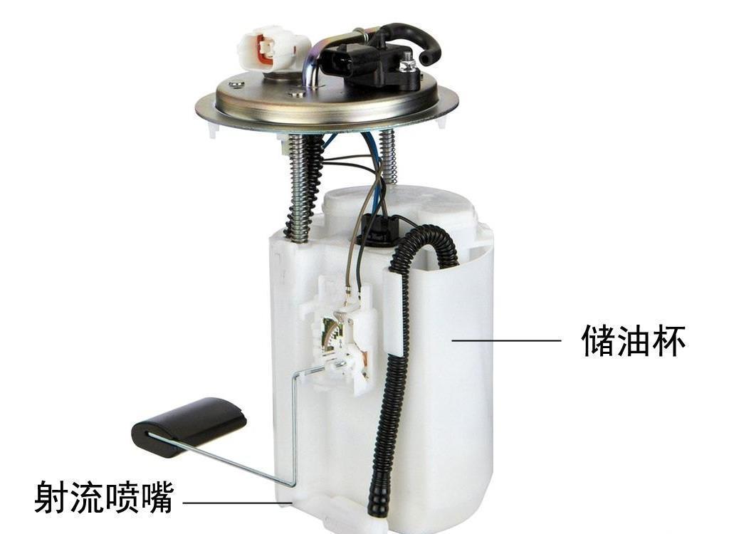 上图是一个汽车的油泵,外面那个白色的是储油杯,油泵电机就装在那里面。油泵工作的时候泵出的油一部分通过输油管供给发动机,另外一少部分提供给储油杯下面的射流喷嘴,射流喷嘴在燃油的驱动下不断地把油箱底部的油往储油杯里吸,而油泵电机就从储油杯里抽油。