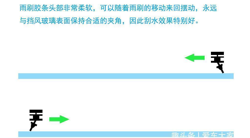 其实雨刷在工作时雨刷胶条的锋面和挡风玻璃表面有一定夹角,锋面从挡风玻璃表面刮过去,就像一个刮水板,可以快速清理干净挡风玻璃上的水渍。