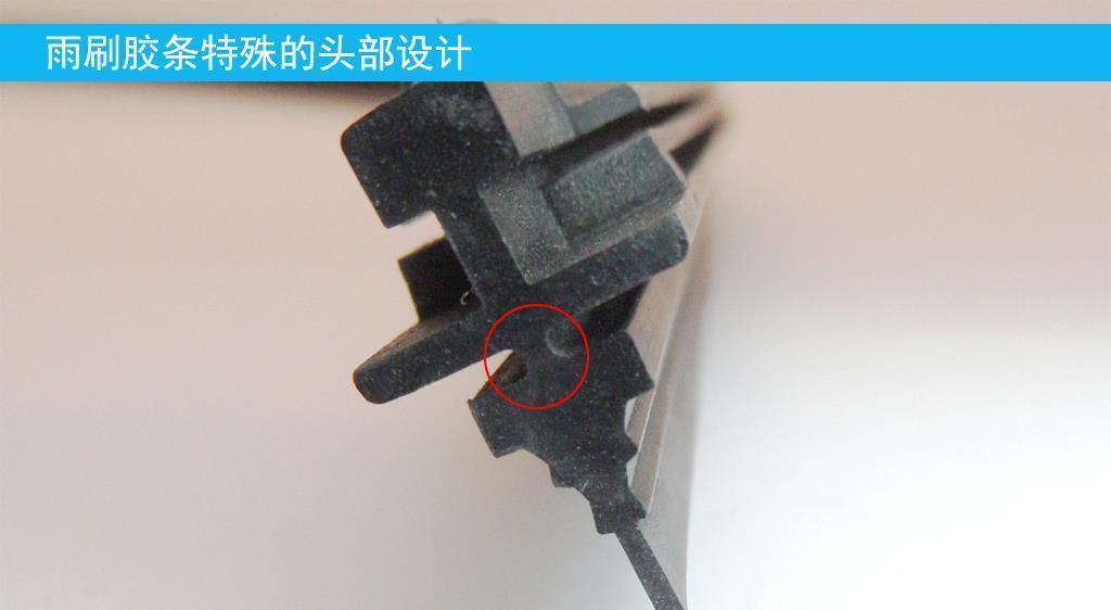 上图是一个雨刷胶条的剖面图,可以看到雨刷锋面与底座之间连接处非常薄,就是为了让雨刷锋面来回摆动时更加灵活,这样雨刷在工作时雨刷片才能跟上雨刷臂的换向动作,及时改变与挡风玻璃的夹角,保证最佳刮水效果。因此当你的挡风玻璃上结冰或者有很厚的积雪时你就别再开雨刷了,很容易把雨刷那脆弱的连接处弄断。
