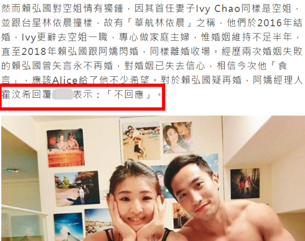 赖弘国有过两段婚姻,除了阿娇之外,他在2016年和“华航林依晨”Ivy Chao登记结婚,两人婚后不到半年就离婚,据Ivy透露,离婚由赖弘国主动提出。