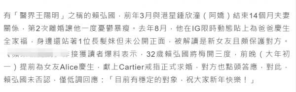 对此,赖弘国没有否认,他低调回应媒体,“目前有稳定的对象,祝大家新年快乐!”