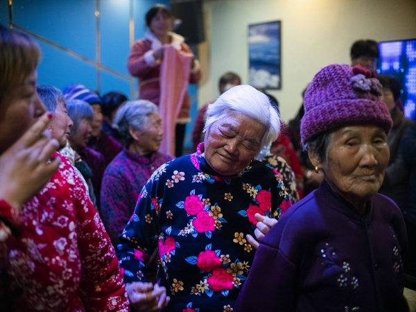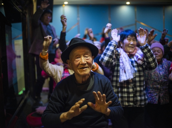 村中KTV昏暗,背景泛着蓝光,30平米空间簇拥着60多个老人。音响里的舞曲节奏鲜明,充斥到整条走廊。83岁的毛宏礼头戴爵士帽,站在人群最前面,爬满褶皱的双手五指张开,在胸前左右摇摆。他整个身体也晃起来,努力要跟上音乐。