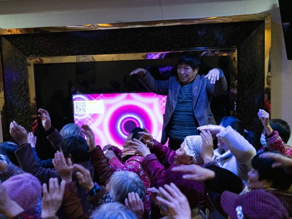 在他身后,老人们穿着花棉袄,白发在头顶变幻的灯光下泛着银光,双脚不停地跺着碎步,高举的双手在半空中随意摇摆。也有四五十岁的人站上桌子,挥动手中的围巾、帽子,烘托现场的气氛。