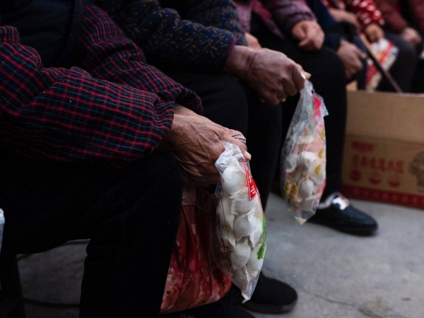 在冬至当天,王明乐给村中每位老人都准备了一袋水饺。