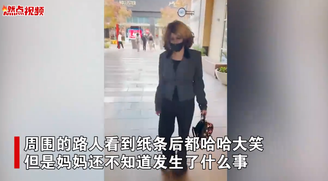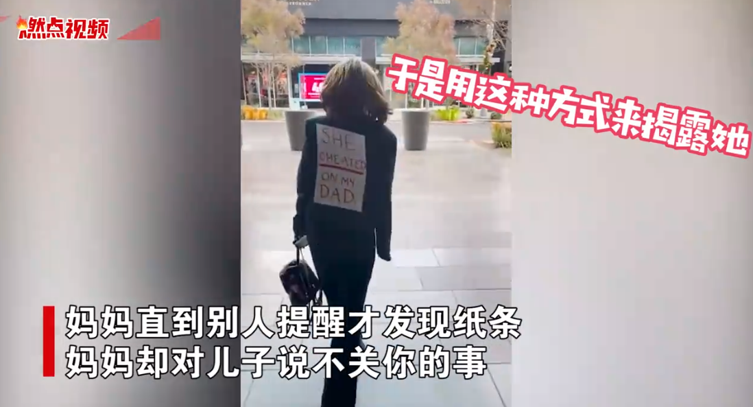周围的路人看到纸条后都哈哈大笑,但是妈妈还不知道发生了什么事。期间还有路人来劝儿子,劝他这种事情应该早点告诉他爸爸。妈妈直到别人提醒才发现纸条,妈妈却对儿子说不关你的事。网友看完后纷纷评论:这儿子和老妈真是一类人,太无语了!
