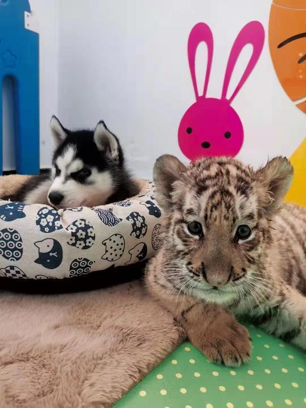 梅留青说,哈士奇与两只老虎,都是2020年11月1日在园区出生,这样的巧合下,他想让一狗二虎在幼时相伴长大。