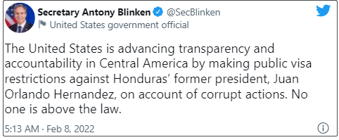 美国国务卿安东尼·布林肯8日在一份声明中说,这位洪都拉斯前领导人通过贿赂和贩毒行为,并利用非法活动的收益为政治运动提供资金。