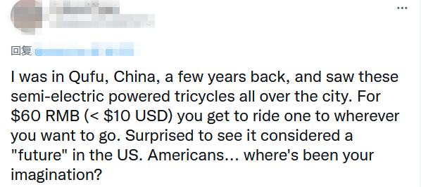 “几年前,我在中国曲阜,看到这些半电动三轮车遍布全城。只需60元人民币(<10美元),就可以骑一辆去任何想去的地方。看到它在美国被视为“未来”,我很惊讶。美国人……你的想象力去哪儿了?”