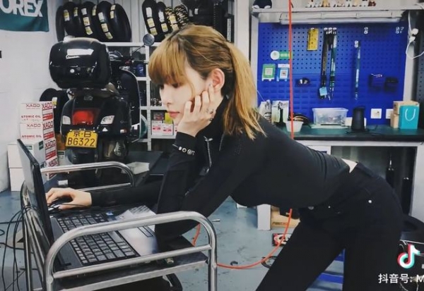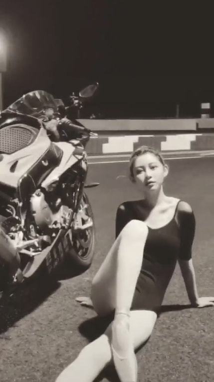 穿着体操服,大晚上地躺在地上,就为了和心爱的小摩托合照。