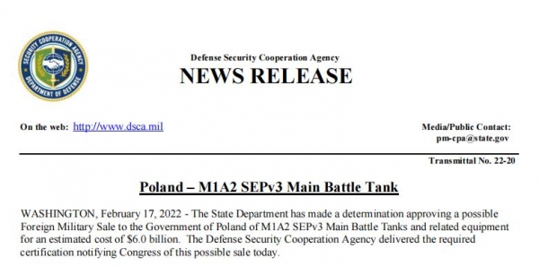 (观察者网讯)当地时间2月17日,美国国防部下属国防安全合作署(DSCA)网站公布,美国国务院已经决定批准向波兰政府出售M1A2 SEPv3“艾布拉姆斯”主战坦克以及相关设备,估计价格约60亿美元。DSCA当天已提供了必要的证明材料,以向国会通知这一可能的军售项目。