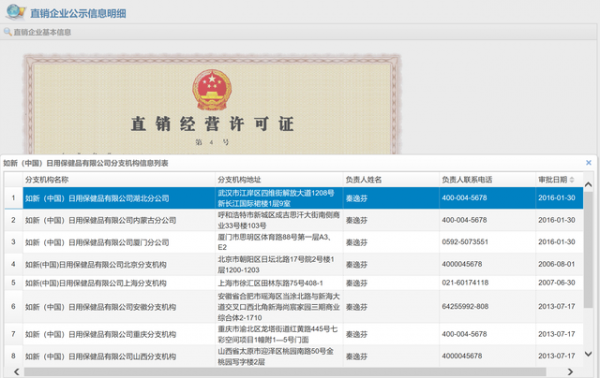 值得注意的是,如新中国于2006年获得商务部颁发的直销经营许可证。此外,在商务部直销行业管理网站查询,如新中国直销区域共有25个,其中湖北分公司位于武汉市江岸区四维街解放大道1208号新长江国际裙楼1层9室,负责人是秦逸芬。