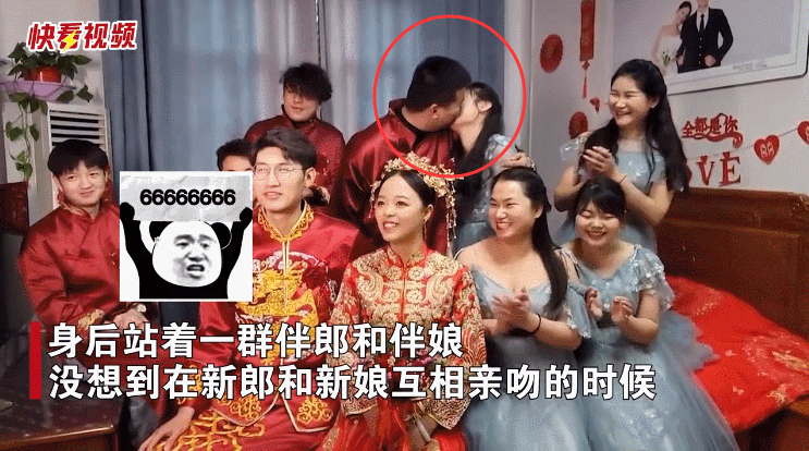 没想到在新郎和新娘互相亲吻的时候,其中一名伴郎突然搂着身旁的伴娘狂亲。