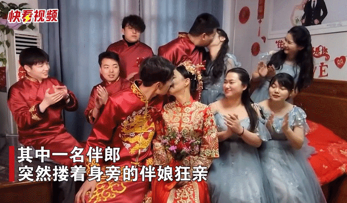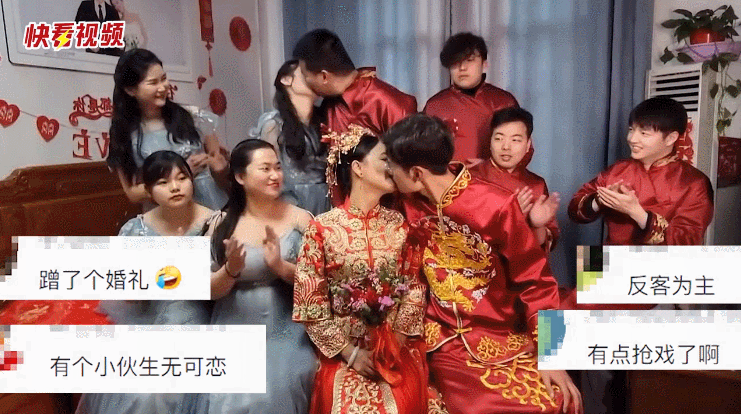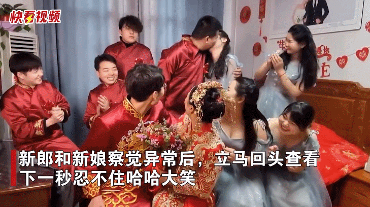 新郎和新娘察觉异常后,立马回头查看,下一秒忍不住哈哈大笑,网友看后纷纷表示:蹭了个婚礼。