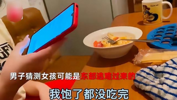 由于两人语言不通,只能通过手机翻译进行沟通。只见女孩吃完饭后,在手机上打出了一系列词汇,翻译为中文是“我饱了”。