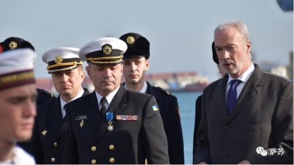 乌克兰海军司令伊霍尔·沃龙琴科中将在接受法国大使颁发的法国荣誉勋章。