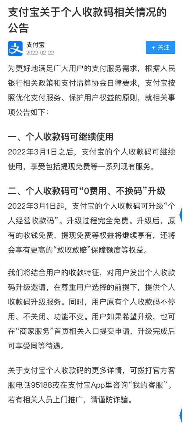 随后微信支付和支付宝都发布公告表示,“个人收款码”可继续使用,也可以升级为“个人经营收款码”,升级后客户将享有更多权益。