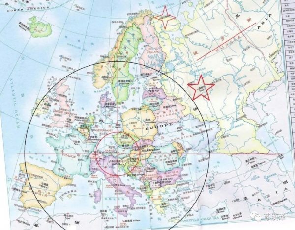 如下图,以环欧洲航海(借助运河)视角看欧洲的话,中心大致在东阿尔卑斯山附近。这么定位,是必须基本囊括北海、西地中海、波罗的海还有爱琴海;加上中心位置必须在多瑙河附近,因为多瑙河加上莱茵河以运河联通的话,能直接连接黑海与北海。