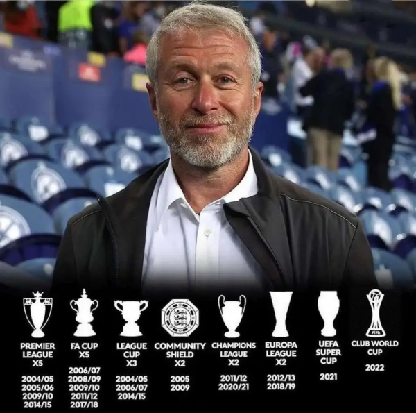 至此,阿布拉莫维奇入主切尔西的19年间,球队总共收获了21个主流赛事冠军,其中包括5个英超冠军,2个欧冠冠军,2个欧联杯冠军,1个欧超杯冠军,5个足总杯冠军,3个联赛杯冠军,2个社区盾冠军。