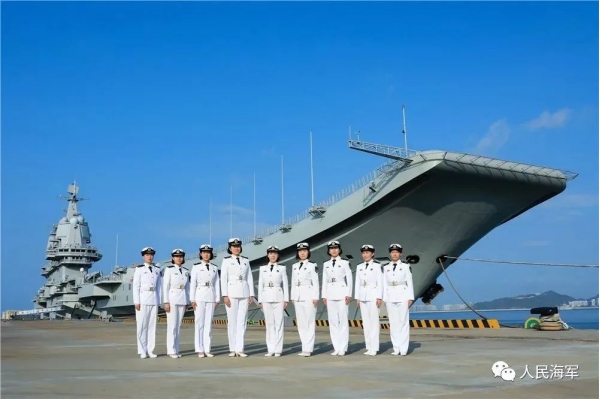 ▲山东舰女舰员(左)和辽宁舰女舰员(右)