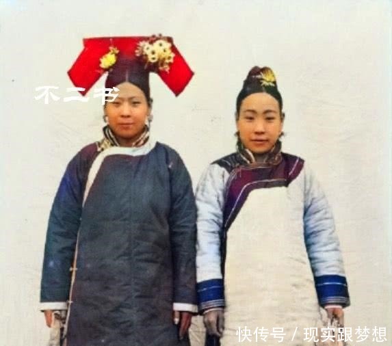 照片拍摄于清末时期,两名北方地区的满族女性站在镜头前,左边的女性头上戴着旗头,可以看出她所梳妆的是绾髻,这是已婚妇女的一个显著特点。